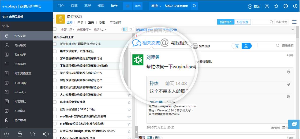 “如何利用新兴社交化技术帮助用户实现更高效的连接?”是泛微近时期一直努力的方向之一。 目前,泛微OA可以提供以下几种在线协作沟通方式,将遍布在企业各个地域、部门和岗位的个体联系起来,保证信息的即时传播和共享,让协作沟通更高效更即时。 在移动OA平台中可以随时调取企业通讯录,对通讯录中的任意人员发送消息或直接拨打电话。 利用内部留言(流程)把需要沟通的内容,关联企业各种资源全面推送,包括包括文档、图片、PPT、其他流程等。 E-message即时通讯,是一款类似QQ的即时聊天工具,支持单聊与群聊,与系统的组织架构同步。无需安装客户端,内嵌在PC端系统中,即开即用。 即时通讯(点击可放大查看) 支持与系统内的用户进行邮件交流,无需一个个记录邮件地址,直接在系统中查找即可。 支持企业多事项跨部门的动态团队来协助事项,只需在协作中发布一个主题,选择参与人员,所有被选择的参与人员可对这个事件展开实时协作交流。 记录每天的工作内容和工作心得,以微博的方式分享给上级和周围的同事; 也可以通过关注了解其他同事的工作情况,打破了只有上下级的汇报关系,让工作更加透明; 另外,可以在微博中随时进行反馈和工作交流,及时调整工作步伐和节奏,提高工作效率。 会前确定时间地点、召集参会人、分发会议资料,并明确各参会人的主要任务;会中通过移动或PC端设备接入会议室,在线即时沟通交流;会后跟踪任务完成情况,通过会议统计报表总结分析。 网络会议(点击可放大查看) 会议报表(点击可放大查看) 系统内可根据发布文档的数量和质量将组织内的人员认证为专家。组织内的任何一名员工可与专家进行在线实时互动,通过短信、邮件、电话等方式直接联系专家。 专家地图(点击可放大查看) 通过系统内部多种多样的协助交流方式,人与人被紧紧地绑在一起,跨越地区、部门和岗位,真正做到了“一方有难,八方来助”。 每个人都不再是一个人在战斗,我们的背后是一支强大的智囊团队,这种被关注有依靠的感觉让前进的每一步都更踏实、更有力。 未来,还有更多的在线连接方式被挖掘出来,我们拭目以待。
